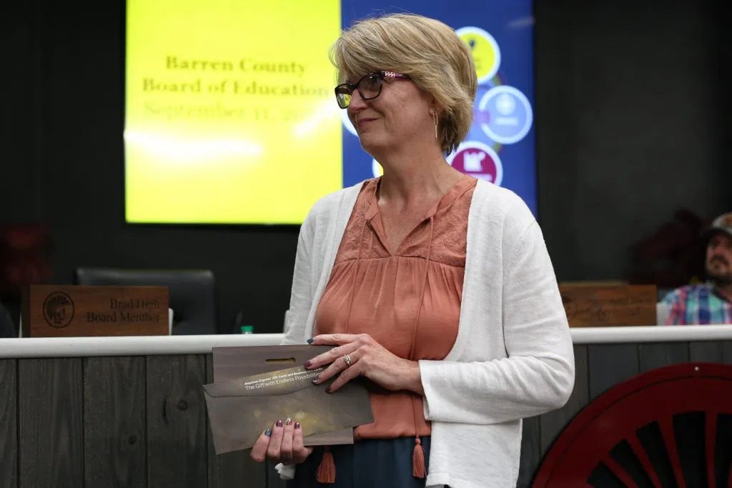Melinda Owens, director of Counseling at Barren Academy of Virtual and Expanded Learning, is recognized as the Support Staff Employee of the Month during the Barren County Schools Board of Education meeting on Thursday, Sept. 11, 2025, at the district’s central office. Will Perkins/Glasgow News 1