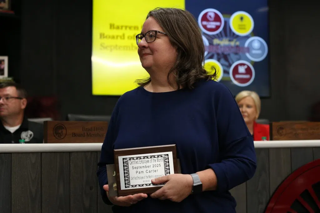 Pam Carter, an instructor at Barren Academy of Virtual and Expanded Learning, is recognized as the Certified Employee of the Month during the Barren County Schools Board of Education meeting on Thursday, Sept. 11, 2025, at the district’s central office. Will Perkins/Glasgow News 1