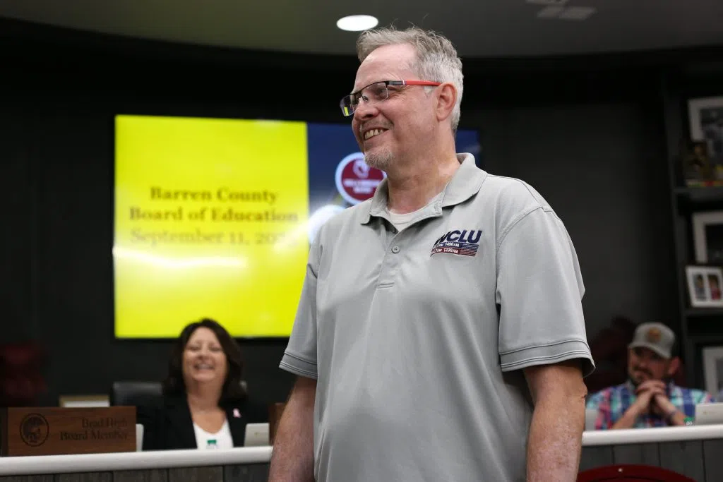 James Brown of Commonwealth Broadcasting is recognized for all his work covering high school sports during the Barren County Schools Board of Education meeting on Thursday, Sept. 11, 2025, at the district’s central office. Will Perkins/Glasgow News 1