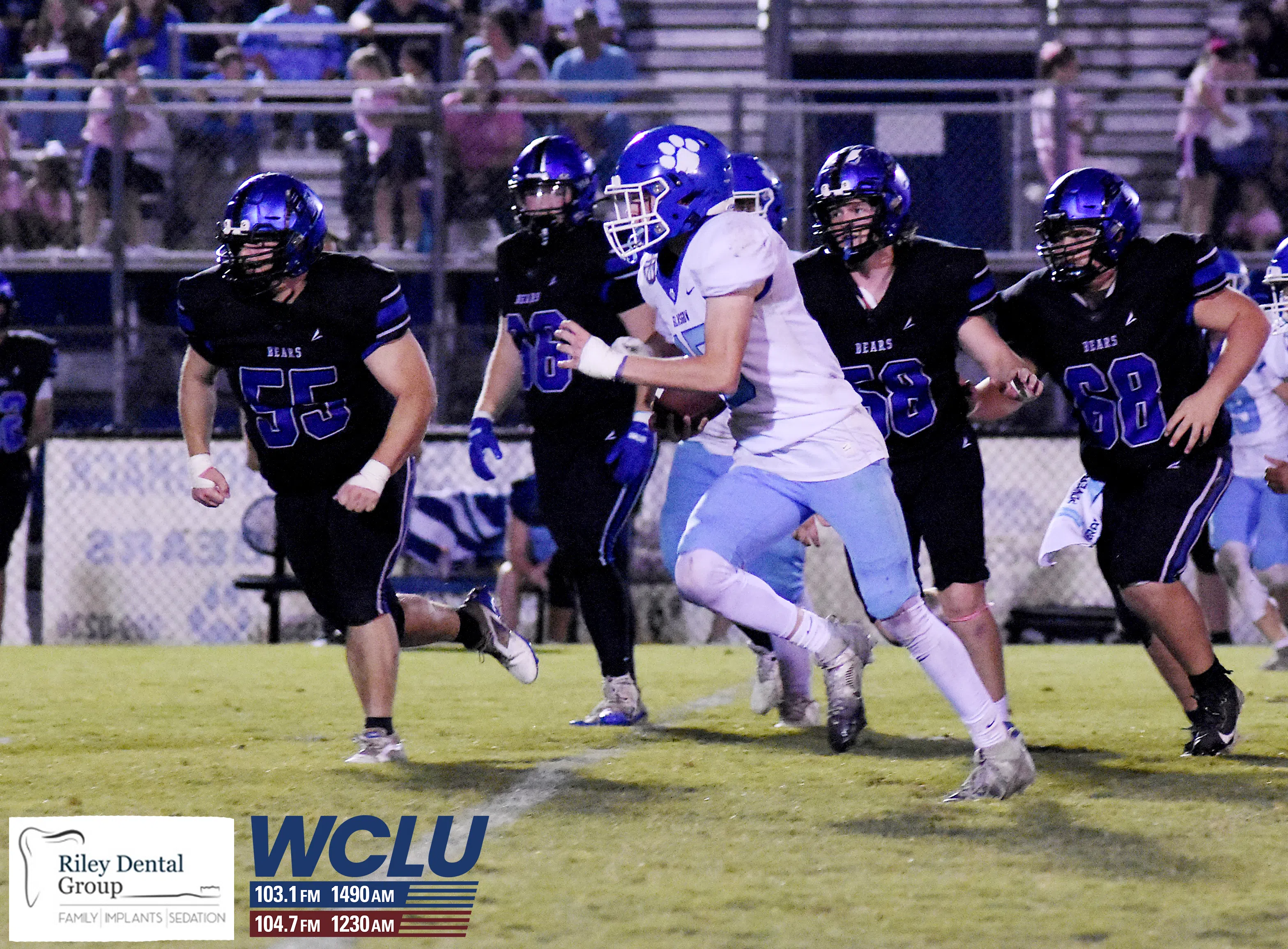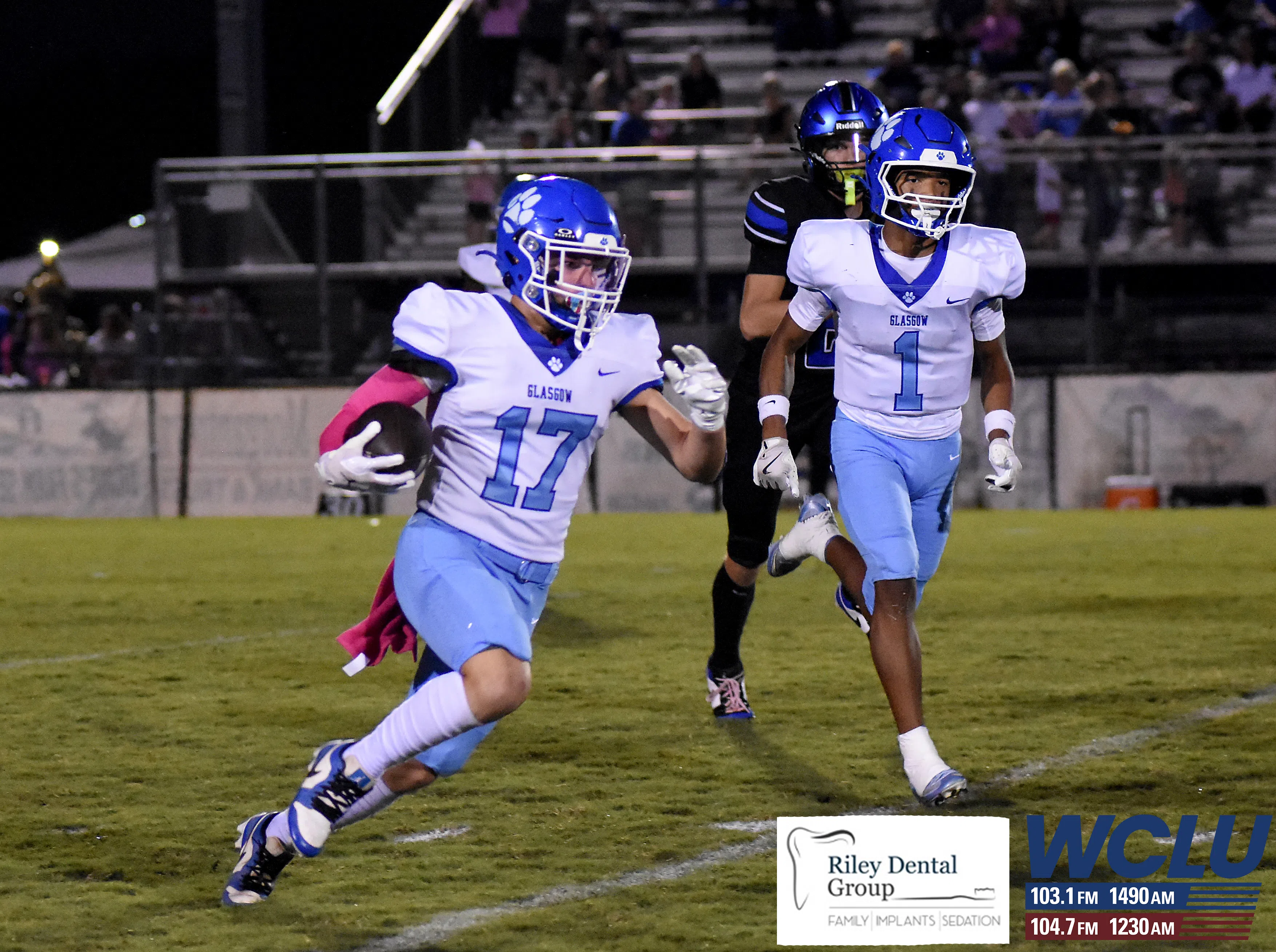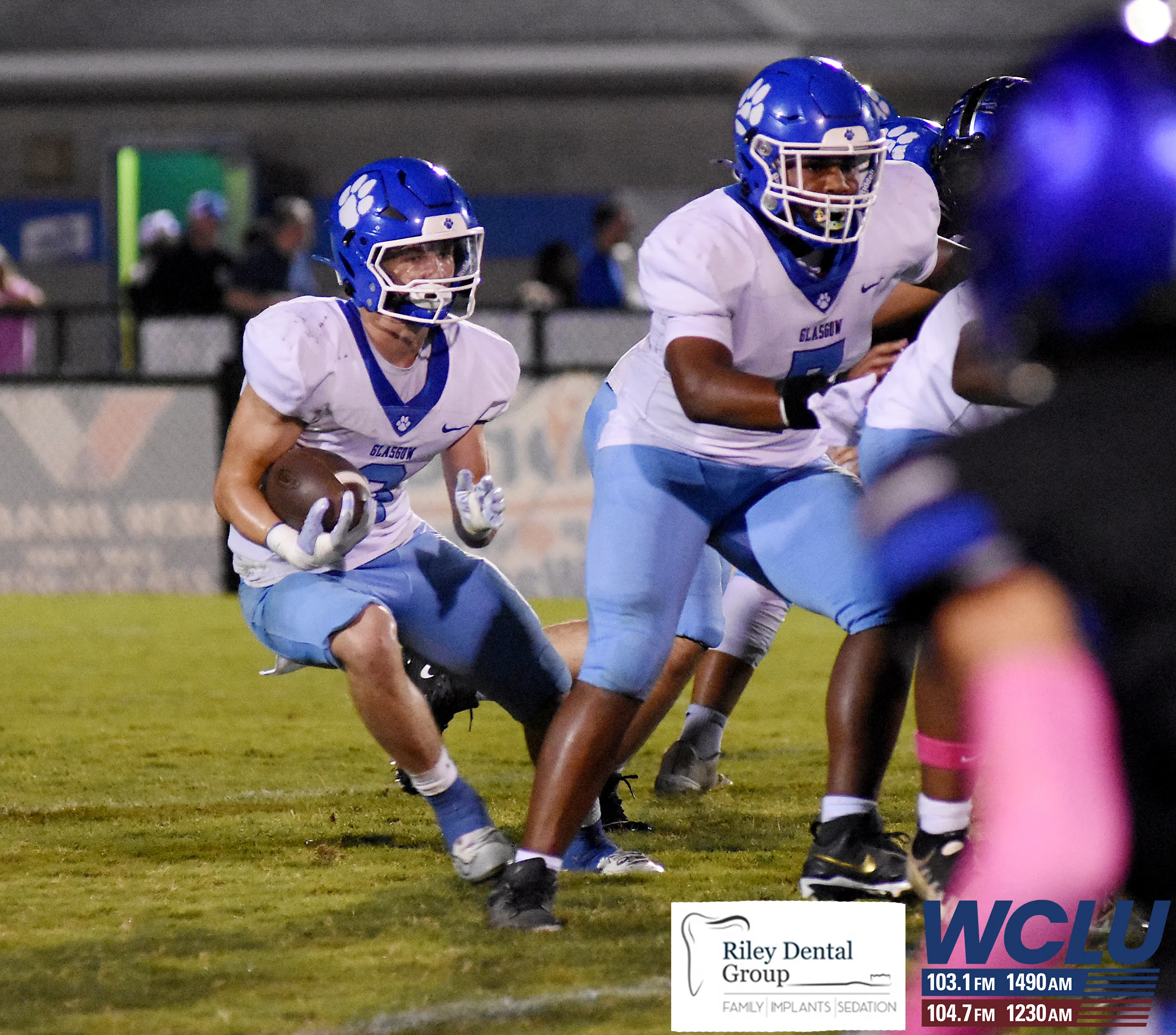 Glasgow’s Cam Bulle runs behind a block from Jaithan Franklin against Butler County. The Scotties won, 64-12. James Brown/WCLU Sports