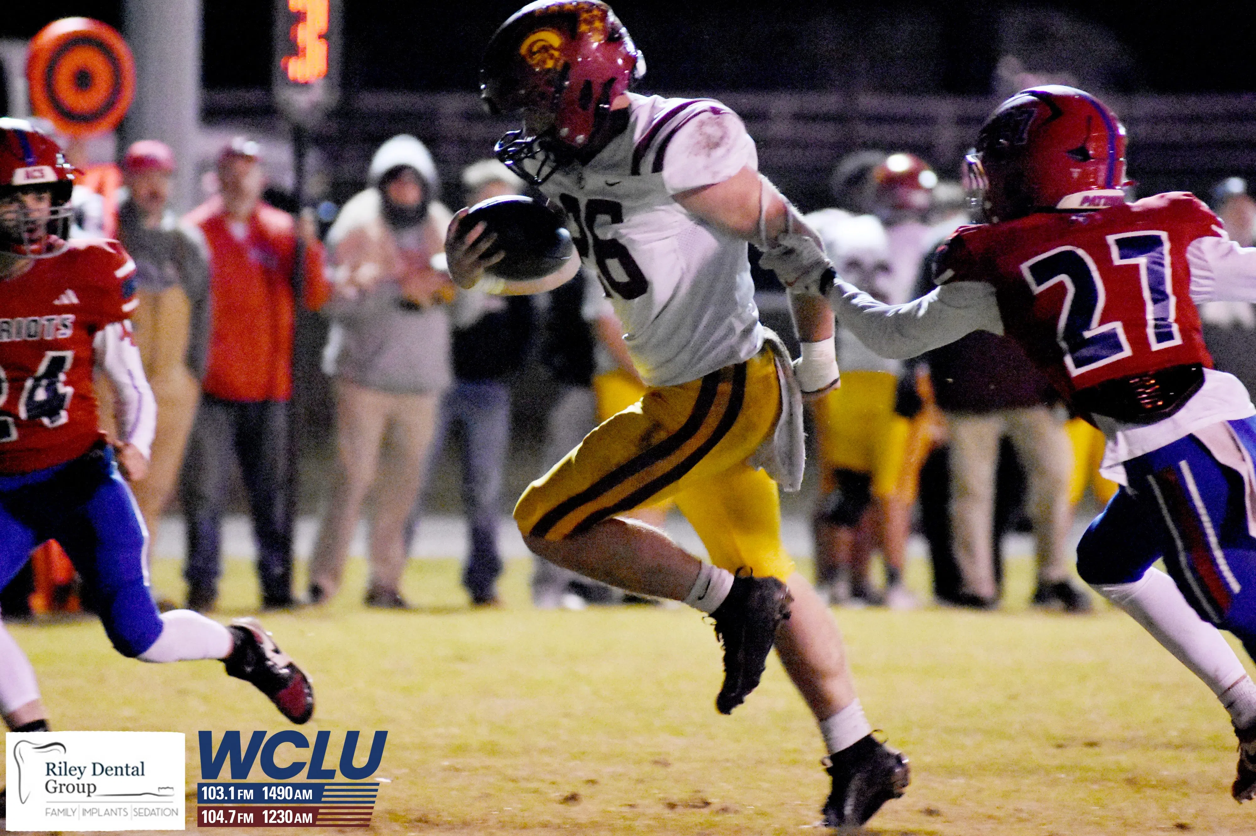 Barren County’s Corbin Wells runs through a hole made by a block from Greyson Billingsley against Allen County-Scottsville. The Trojans won, 40-0. James Brown/WCLU Sports