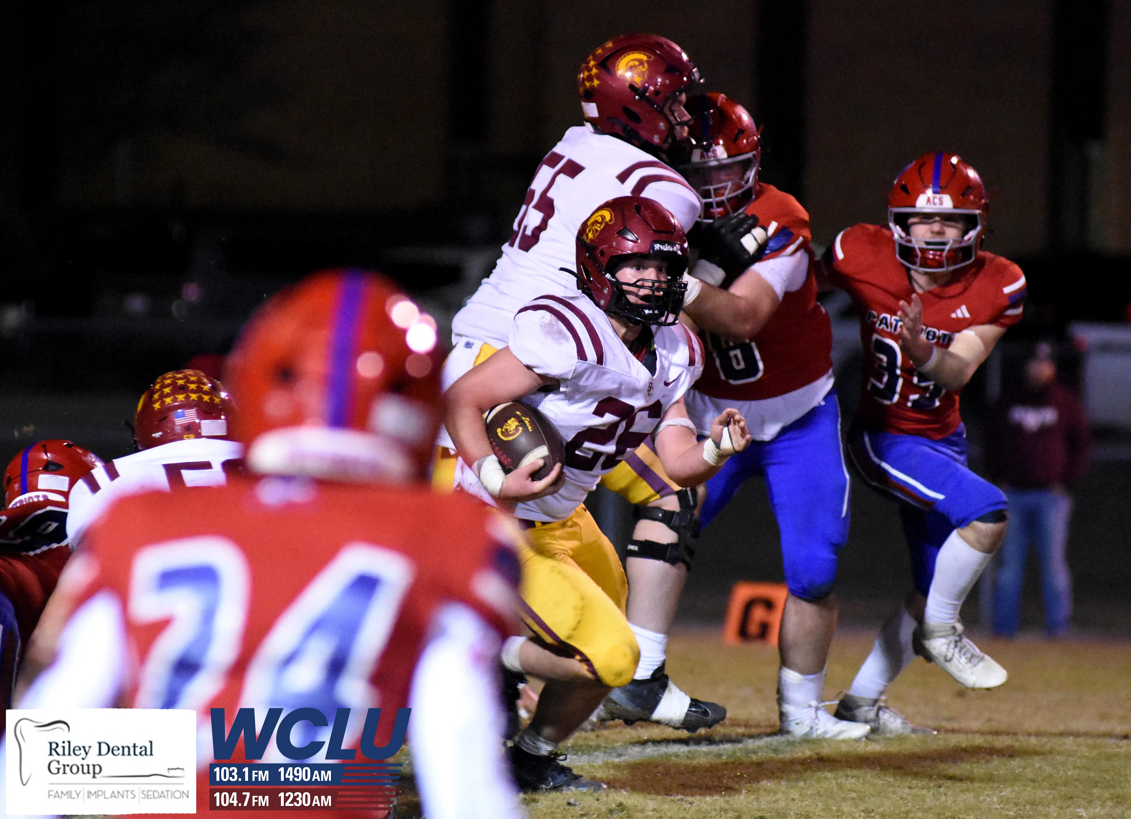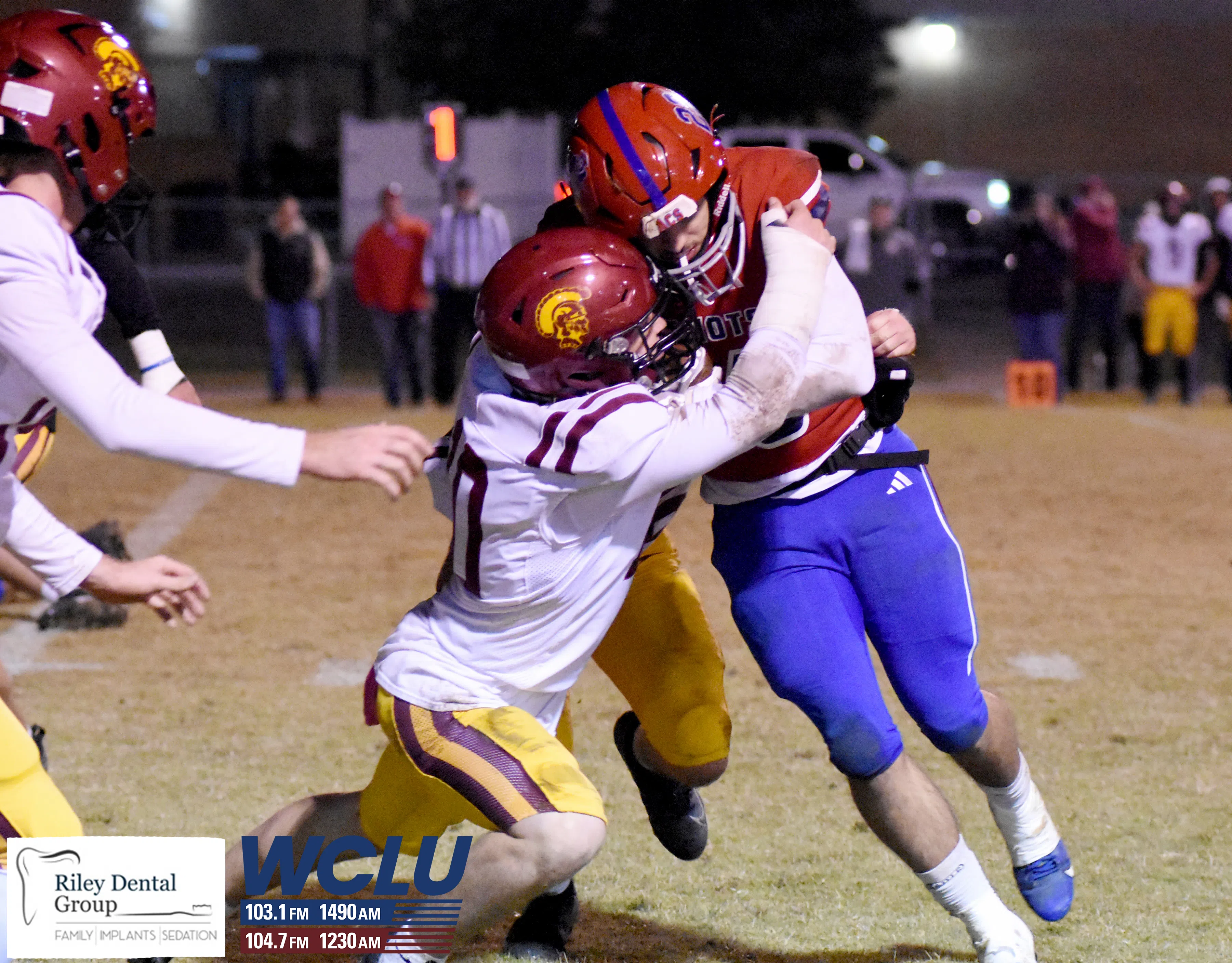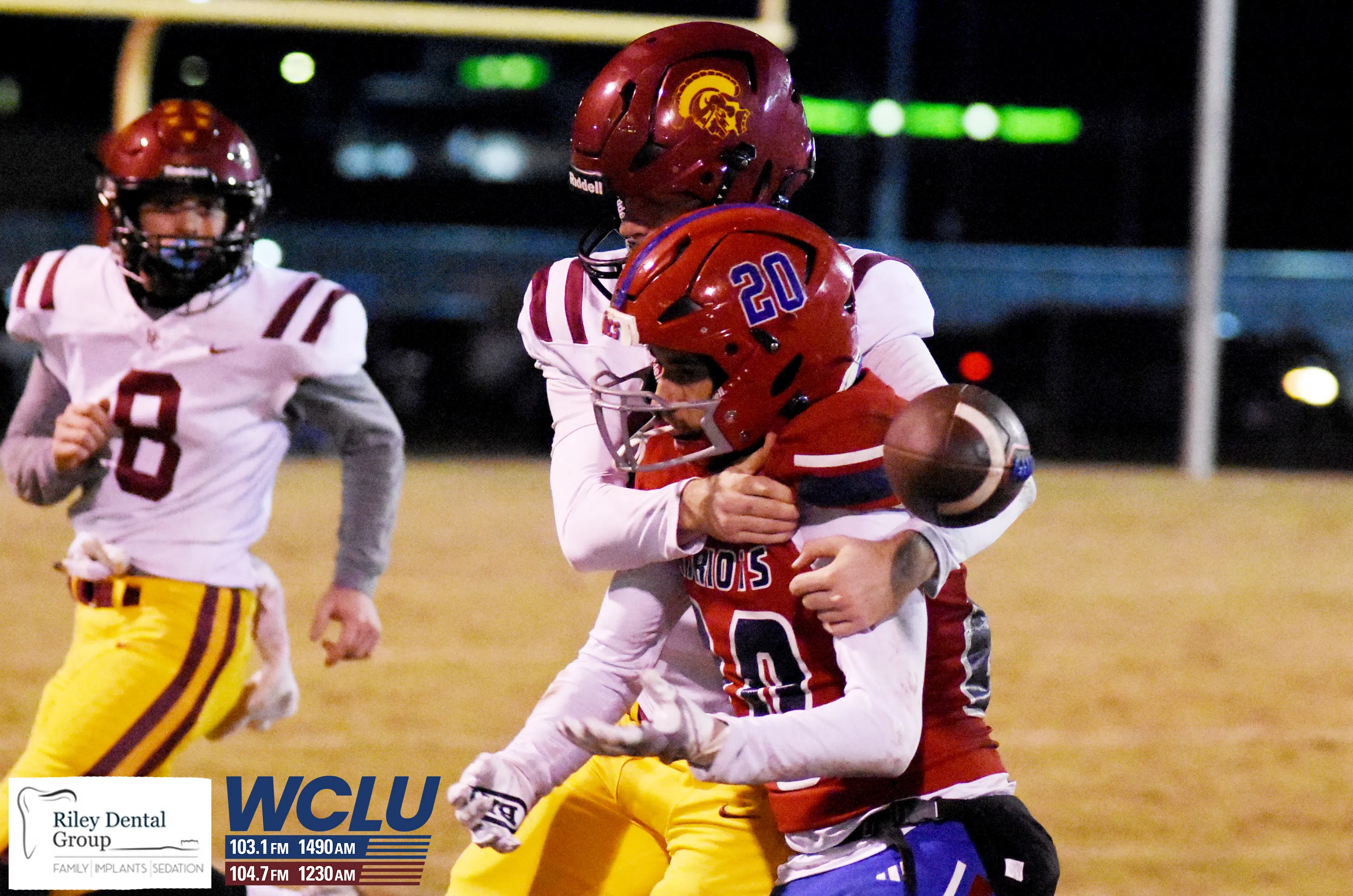 Barren County’s Gage Driver forces a fumble against Allen County-Scottsville. The Trojans won, 40-0. James Brown/WCLU Sports