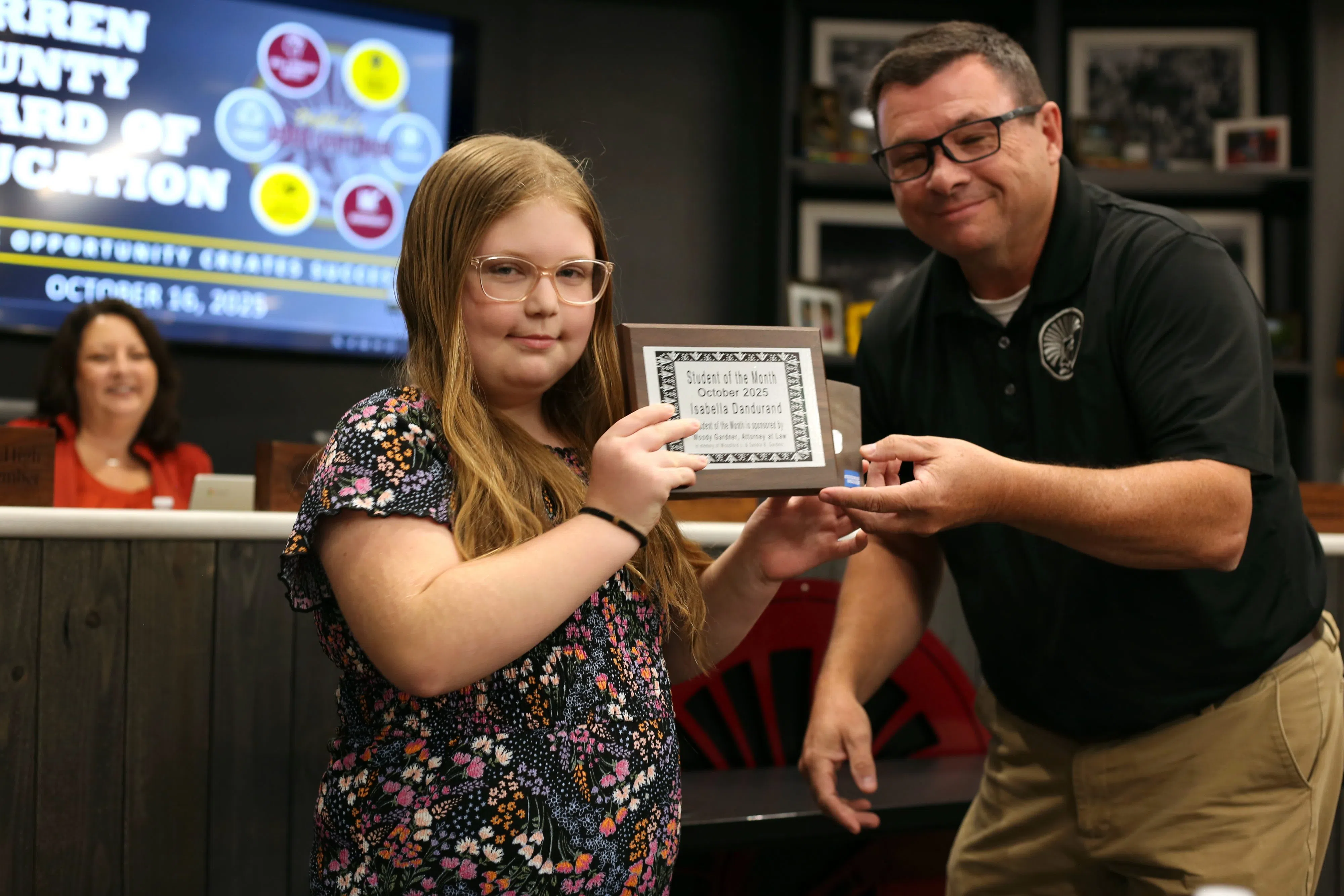 Hiseville Elementary’s Isabella Dandurand was recognized as the Student of the Month at the Barren County Schools Board of Education regular meeting on Oct. 16, 2025. Will Perkins/Glasgow News 1