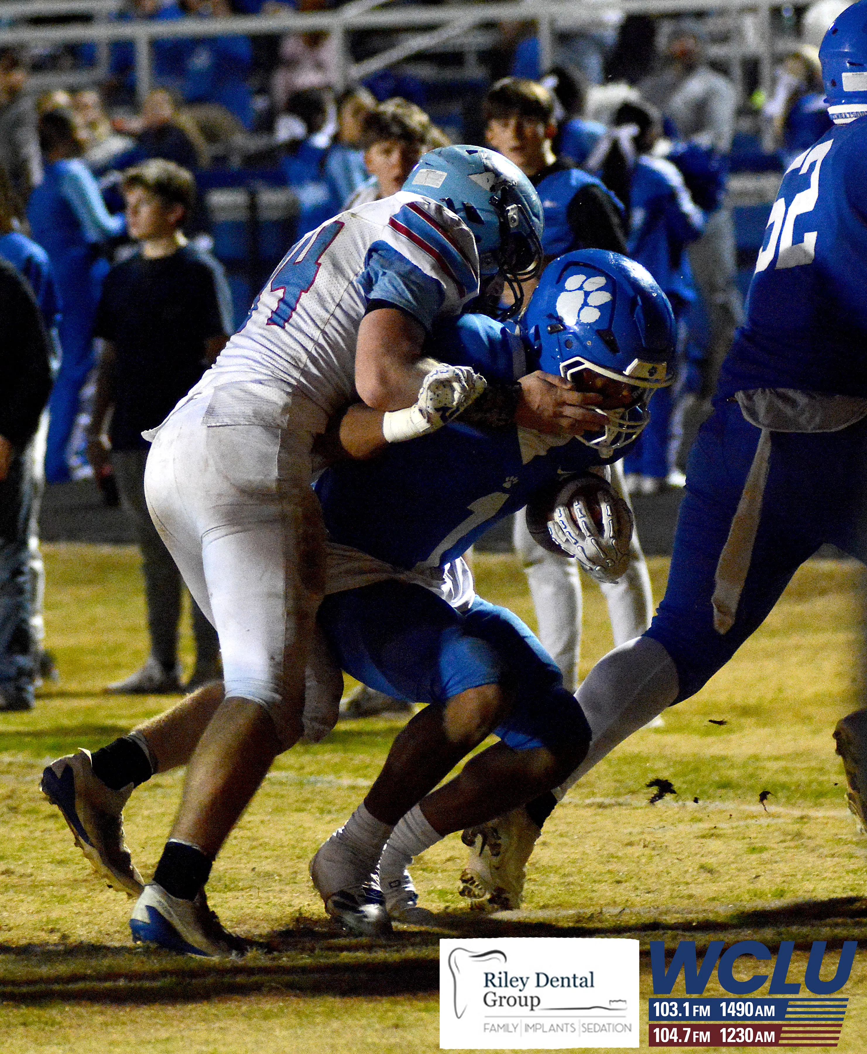 Glasgow’s Grayson Bartley and Jordan Huffman combine for a tackle against Union County in the second round of the Class 3A Playoffs. The Scotties lost, 10-7. Auggie Brown/WCLU Sports