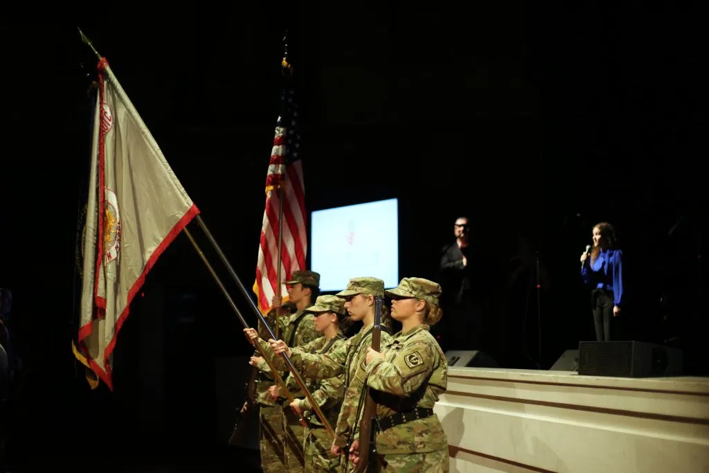 Members of Barren County High School’s JROTC present the colors for the national anthem, which was performed by Glasgow High School senior Raegan Blair, on Thursday, Nov. 20, 2025, at the 13th annual Children’s Day at the Plaza Theatre. Will Perkins/Glasgow News 1