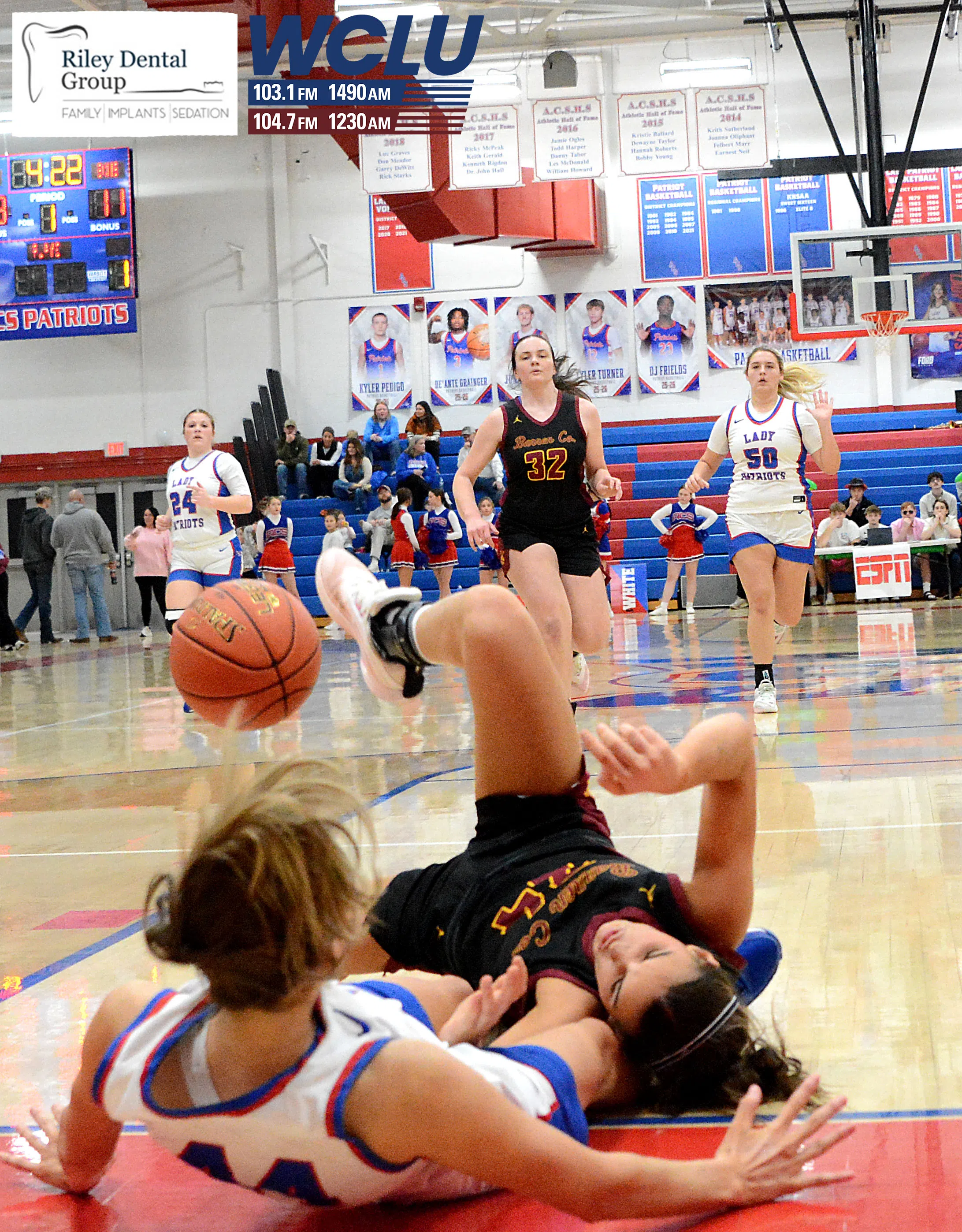 Barren County’s Shelby Byrd crashes to the floor after colliding with a defender against Allen County-Scottsville. The Trojanettes won, 75-45. Auggie Brown/WCLU Sports