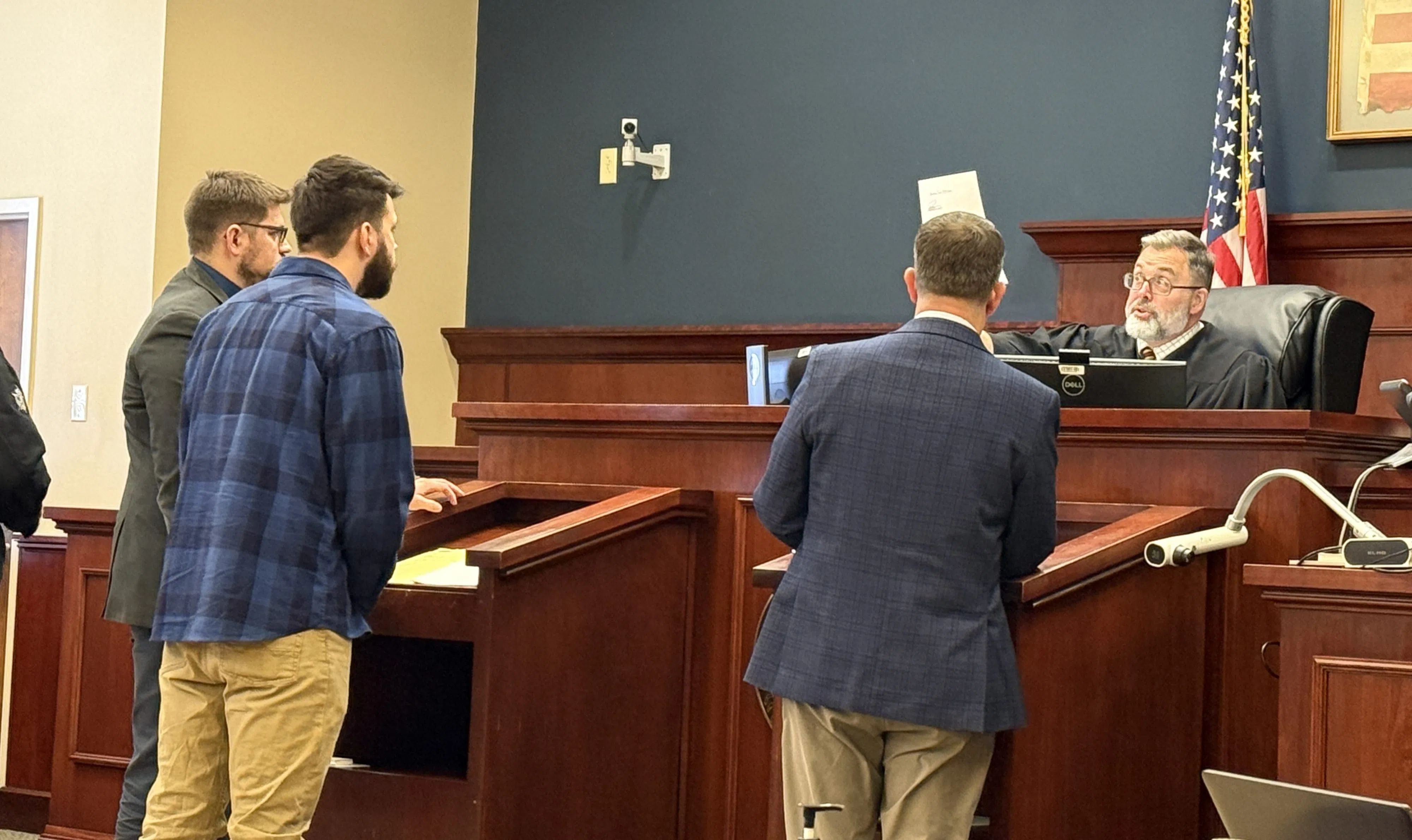 Derek T. Shaffer, middle foreground, listens as Barren County Circuit Court Judge John Alexander reads the guilty plea on Feb. 9. Michael Crimmins/Glasgow News 1