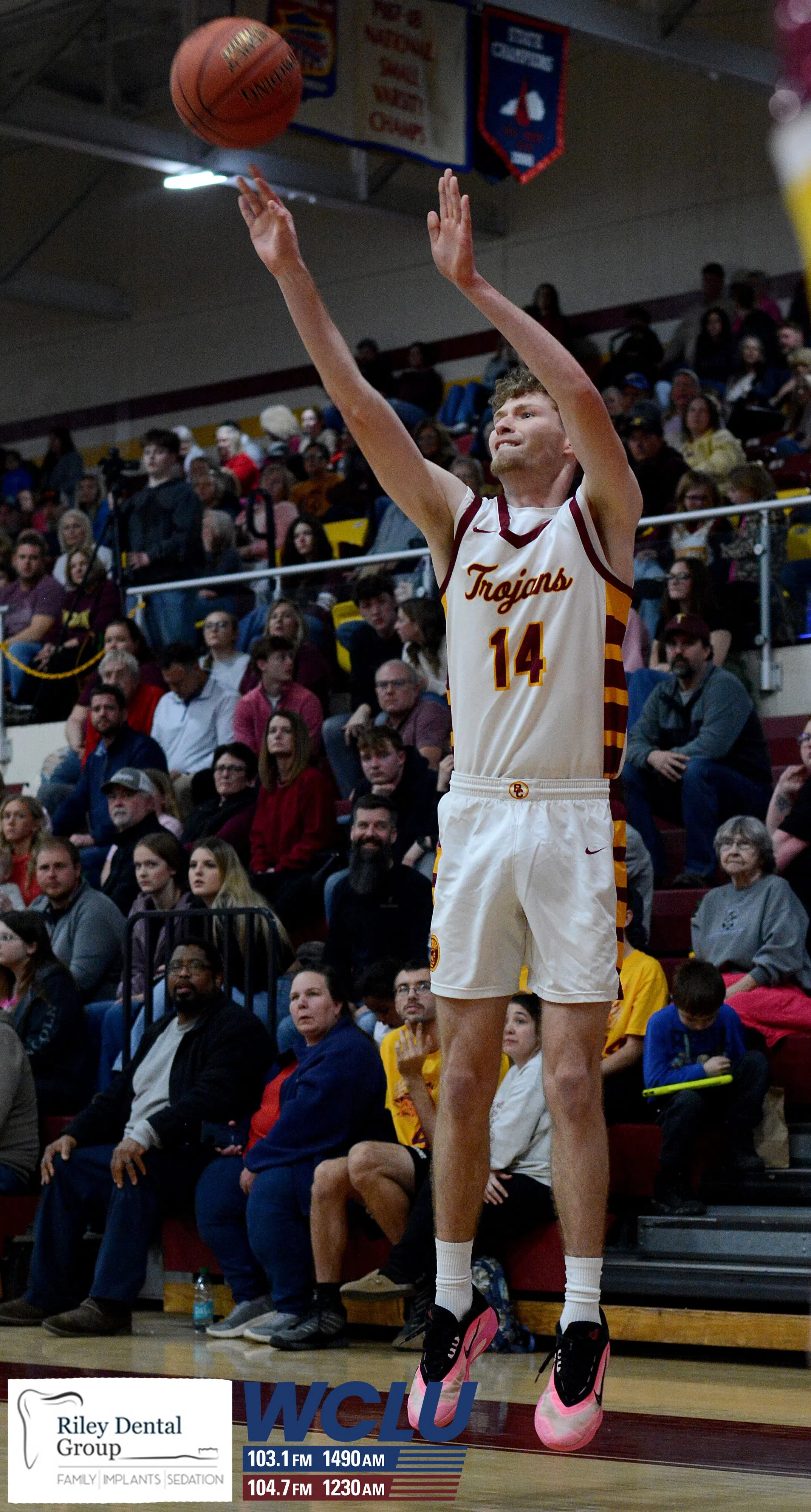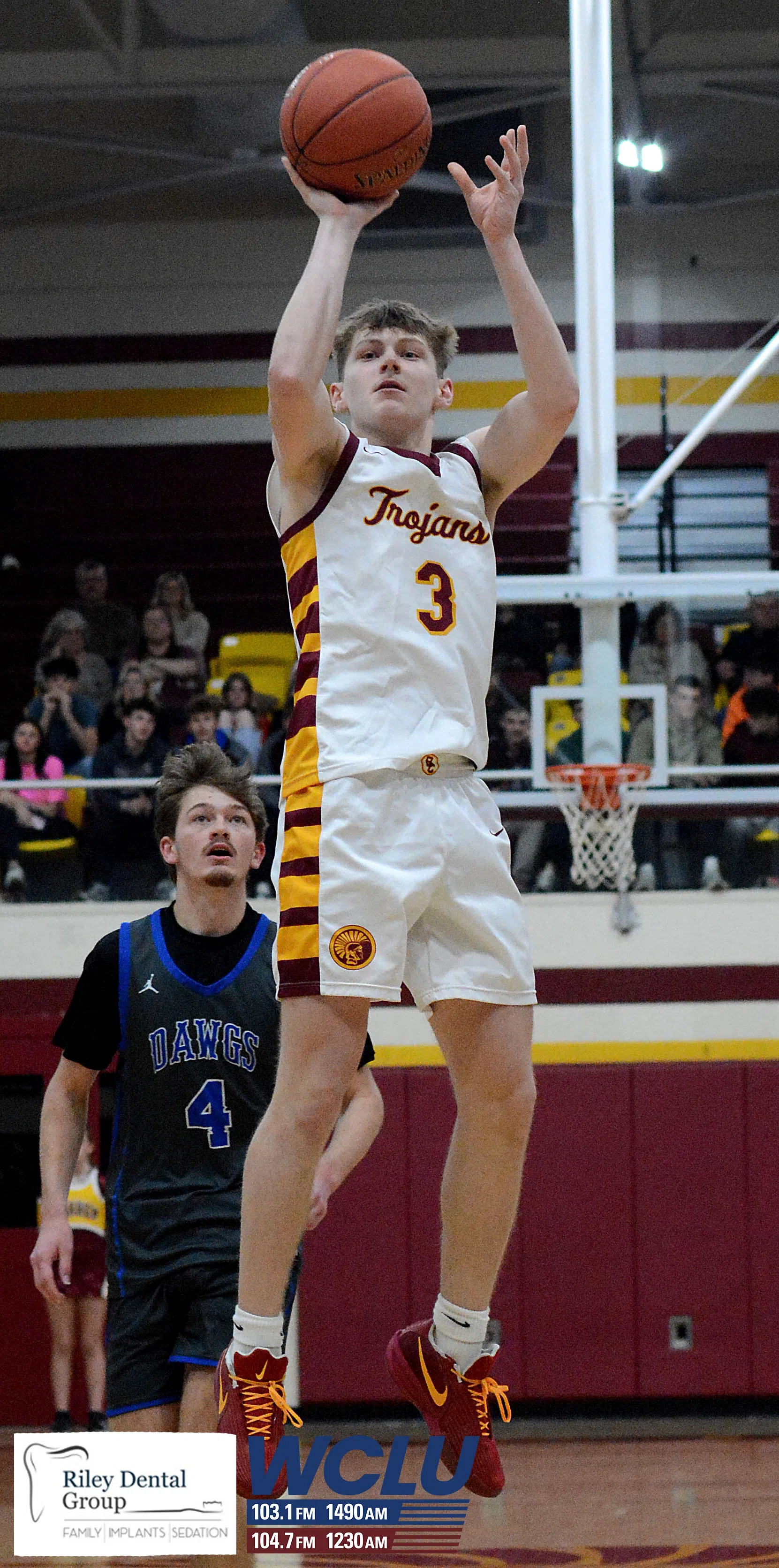 Barren County’s Weston Shelton shoots a 3-pointer against Clinton County. The Trojans lost, 59-49. Auggie Brown/WCLU Sports