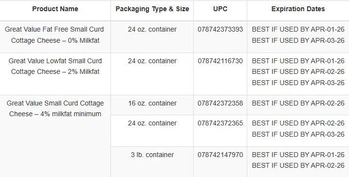 – Impacted items are Great Value fat free, 2% lowfat and 4% small curd cottage cheese in 16 oz., 24 oz. and 3 lb. tubs