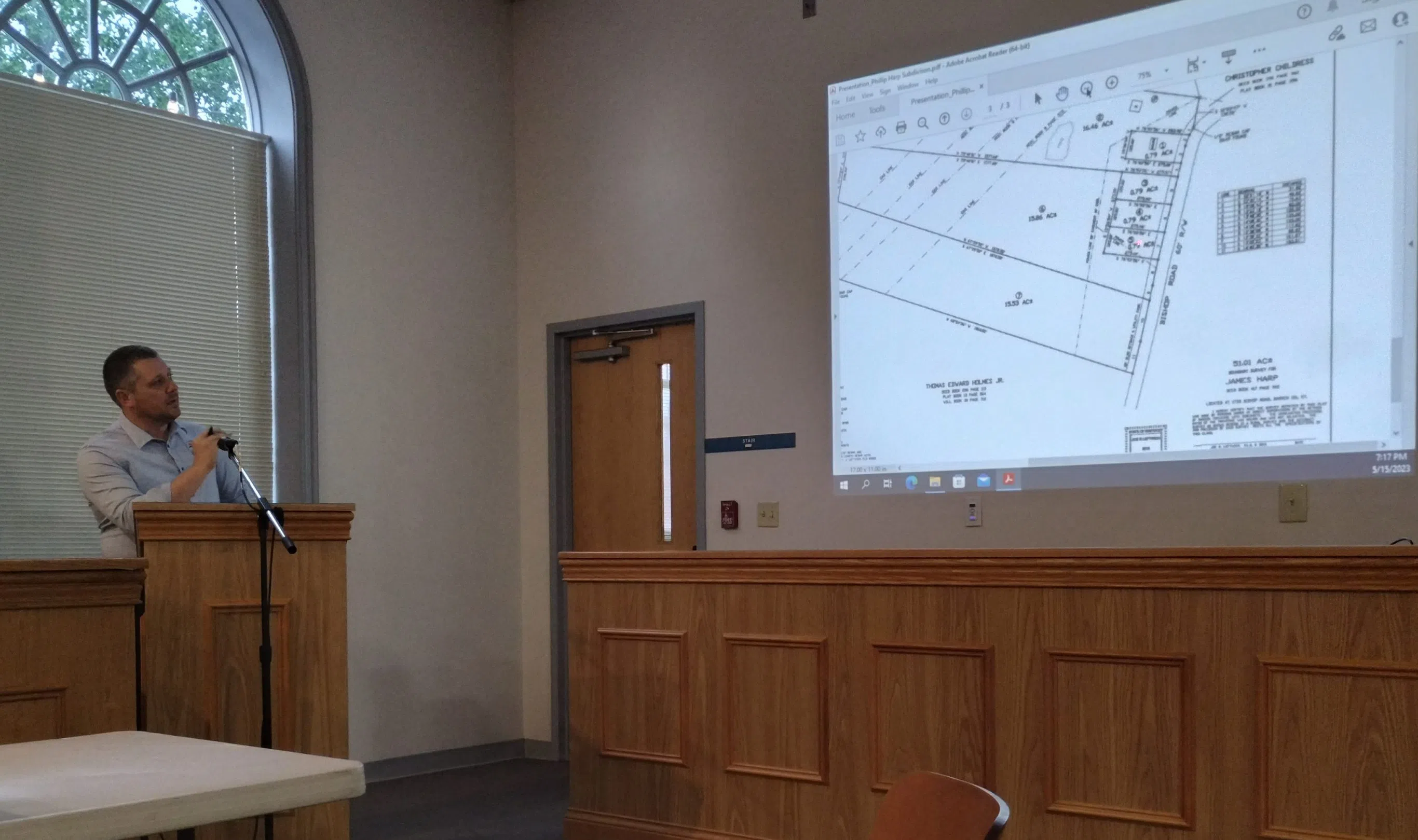 Kevin Myatt, planning director for the Joint City-County Planning Commission of Barren County, describes the location of tracts on a plat at Monday's commission meeting.  MELINDA J. OVERSTREET